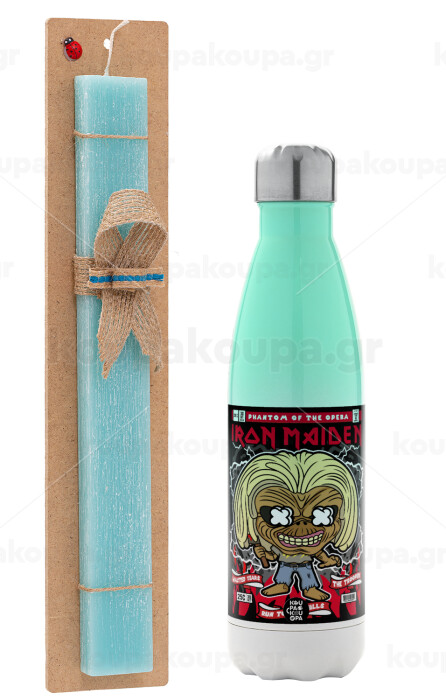 Iron maiden (eddie), Πασχαλινή Λαμπάδα με Μεταλλικό παγούρι θερμός Πράσινο/Λευκό (Stainless steel), διπλού τοιχώματος, 500ml & κερί αρωματικό πλακέ (30cm) (ΤΙΡΚΟΥΑΖ)