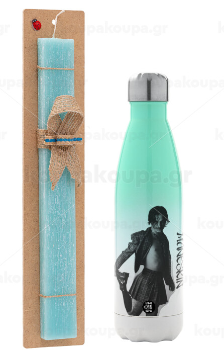 Maneskin Damiano David, Πασχαλινή Λαμπάδα με Μεταλλικό παγούρι θερμός Πράσινο/Λευκό (Stainless steel), διπλού τοιχώματος, 500ml & κερί αρωματικό πλακέ (30cm) (ΤΙΡΚΟΥΑΖ)