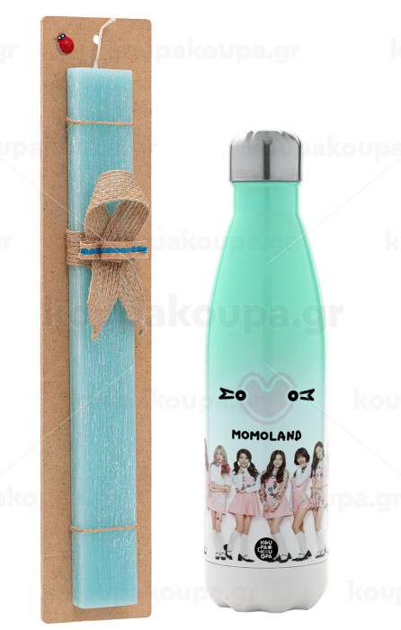 Momoland pink, Πασχαλινή Λαμπάδα με Μεταλλικό παγούρι θερμός Πράσινο/Λευκό (Stainless steel), διπλού τοιχώματος, 500ml & κερί αρωματικό πλακέ (30cm) (ΤΙΡΚΟΥΑΖ)