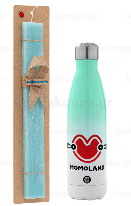 Momoland, Πασχαλινή Λαμπάδα με Μεταλλικό παγούρι θερμός Πράσινο/Λευκό (Stainless steel), διπλού τοιχώματος, 500ml & κερί αρωματικό πλακέ (30cm) (ΤΙΡΚΟΥΑΖ)