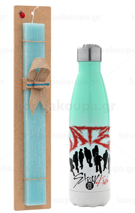 Stray Kids Boy band, Πασχαλινή Λαμπάδα με Μεταλλικό παγούρι θερμός Πράσινο/Λευκό (Stainless steel), διπλού τοιχώματος, 500ml & κερί αρωματικό πλακέ (30cm) (ΤΙΡΚΟΥΑΖ)