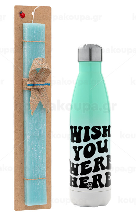 Wish you were here, Πασχαλινή Λαμπάδα με Μεταλλικό παγούρι θερμός Πράσινο/Λευκό (Stainless steel), διπλού τοιχώματος, 500ml & κερί αρωματικό πλακέ (30cm) (ΤΙΡΚΟΥΑΖ)