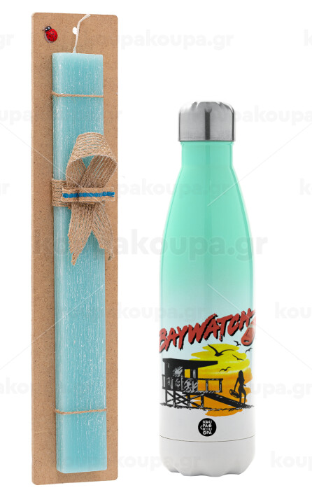 Baywatch, Πασχαλινή Λαμπάδα με Μεταλλικό παγούρι θερμός Πράσινο/Λευκό (Stainless steel), διπλού τοιχώματος, 500ml & κερί αρωματικό πλακέ (30cm) (ΤΙΡΚΟΥΑΖ)
