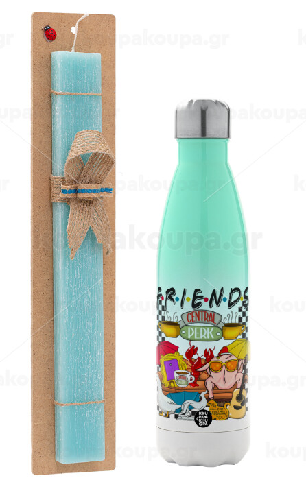 Τα φιλαράκια, Πασχαλινή Λαμπάδα με Μεταλλικό παγούρι θερμός Πράσινο/Λευκό (Stainless steel), διπλού τοιχώματος, 500ml & κερί αρωματικό πλακέ (30cm) (ΤΙΡΚΟΥΑΖ)