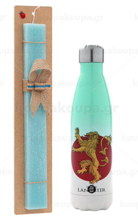 House Lannister GOT, Πασχαλινή Λαμπάδα με Μεταλλικό παγούρι θερμός Πράσινο/Λευκό (Stainless steel), διπλού τοιχώματος, 500ml & κερί αρωματικό πλακέ (30cm) (ΤΙΡΚΟΥΑΖ)