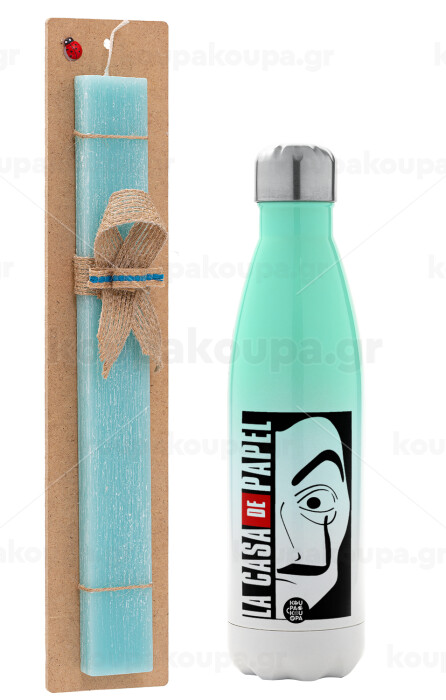 La casa de papel vertical, Πασχαλινή Λαμπάδα με Μεταλλικό παγούρι θερμός Πράσινο/Λευκό (Stainless steel), διπλού τοιχώματος, 500ml & κερί αρωματικό πλακέ (30cm) (ΤΙΡΚΟΥΑΖ)