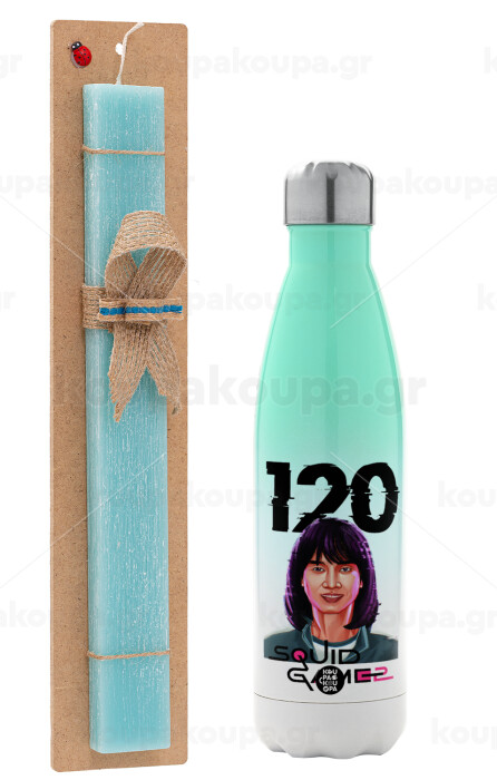 Squid game 120 Cho Hyun-ju, Πασχαλινή Λαμπάδα με Μεταλλικό παγούρι θερμός Πράσινο/Λευκό (Stainless steel), διπλού τοιχώματος, 500ml & κερί αρωματικό πλακέ (30cm) (ΤΙΡΚΟΥΑΖ)