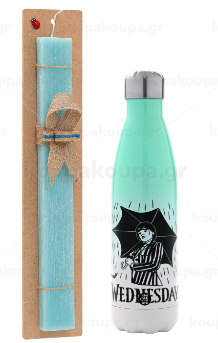 Wednesday Addams, Πασχαλινή Λαμπάδα με Μεταλλικό παγούρι θερμός Πράσινο/Λευκό (Stainless steel), διπλού τοιχώματος, 500ml & κερί αρωματικό πλακέ (30cm) (ΤΙΡΚΟΥΑΖ)