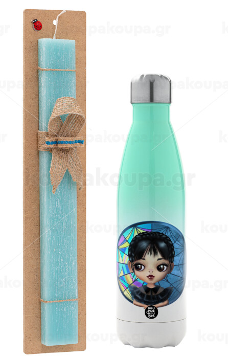 Wednesday big eyes, Πασχαλινή Λαμπάδα με Μεταλλικό παγούρι θερμός Πράσινο/Λευκό (Stainless steel), διπλού τοιχώματος, 500ml & κερί αρωματικό πλακέ (30cm) (ΤΙΡΚΟΥΑΖ)