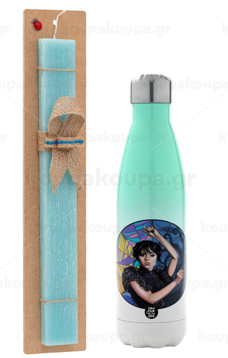 Wednesday dance, Πασχαλινή Λαμπάδα με Μεταλλικό παγούρι θερμός Πράσινο/Λευκό (Stainless steel), διπλού τοιχώματος, 500ml & κερί αρωματικό πλακέ (30cm) (ΤΙΡΚΟΥΑΖ)