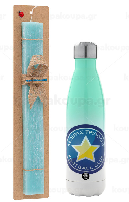 Αστέρας Τρίπολης, Πασχαλινή Λαμπάδα με Μεταλλικό παγούρι θερμός Πράσινο/Λευκό (Stainless steel), διπλού τοιχώματος, 500ml & κερί αρωματικό πλακέ (30cm) (ΤΙΡΚΟΥΑΖ)