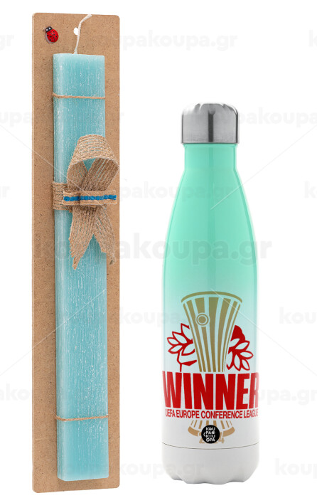 Europa Conference League WINNER, Πασχαλινή Λαμπάδα με Μεταλλικό παγούρι θερμός Πράσινο/Λευκό (Stainless steel), διπλού τοιχώματος, 500ml & κερί αρωματικό πλακέ (30cm) (ΤΙΡΚΟΥΑΖ)