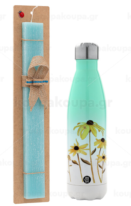 Daisies flower, Πασχαλινή Λαμπάδα με Μεταλλικό παγούρι θερμός Πράσινο/Λευκό (Stainless steel), διπλού τοιχώματος, 500ml & κερί αρωματικό πλακέ (30cm) (ΤΙΡΚΟΥΑΖ)