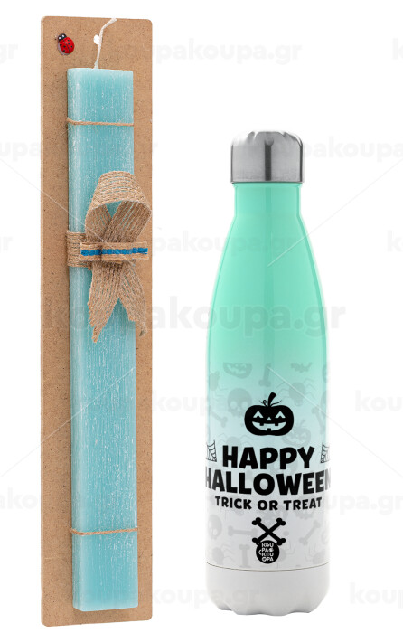Happy Halloween pumpkin, Πασχαλινή Λαμπάδα με Μεταλλικό παγούρι θερμός Πράσινο/Λευκό (Stainless steel), διπλού τοιχώματος, 500ml & κερί αρωματικό πλακέ (30cm) (ΤΙΡΚΟΥΑΖ)