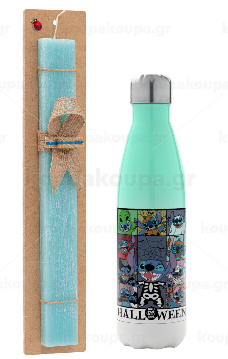 Stitch Halloween, Πασχαλινή Λαμπάδα με Μεταλλικό παγούρι θερμός Πράσινο/Λευκό (Stainless steel), διπλού τοιχώματος, 500ml & κερί αρωματικό πλακέ (30cm) (ΤΙΡΚΟΥΑΖ)