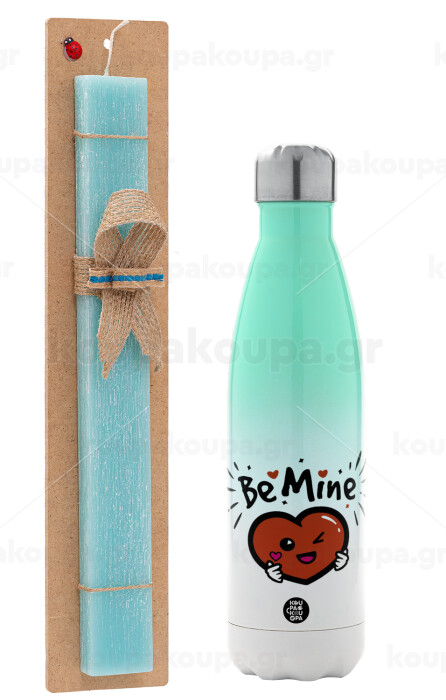 Be mine!, Πασχαλινή Λαμπάδα με Μεταλλικό παγούρι θερμός Πράσινο/Λευκό (Stainless steel), διπλού τοιχώματος, 500ml & κερί αρωματικό πλακέ (30cm) (ΤΙΡΚΟΥΑΖ)