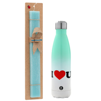 I ❤️ U, Πασχαλινή Λαμπάδα με Μεταλλικό παγούρι θερμός Πράσινο/Λευκό (Stainless steel), διπλού τοιχώματος, 500ml & κερί αρωματικό πλακέ (30cm) (ΤΙΡΚΟΥΑΖ)