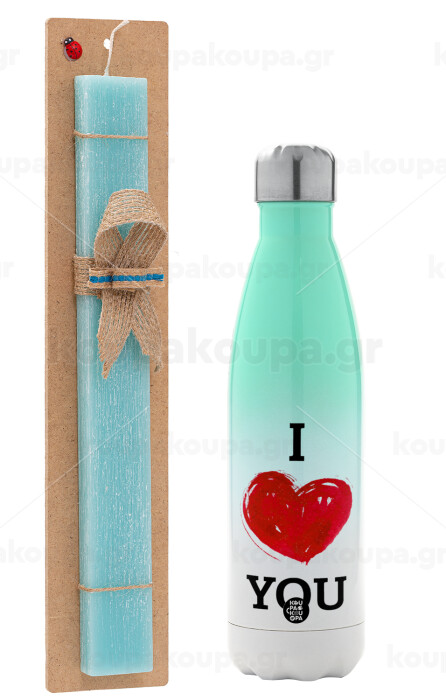 I Love You, Πασχαλινή Λαμπάδα με Μεταλλικό παγούρι θερμός Πράσινο/Λευκό (Stainless steel), διπλού τοιχώματος, 500ml & κερί αρωματικό πλακέ (30cm) (ΤΙΡΚΟΥΑΖ)