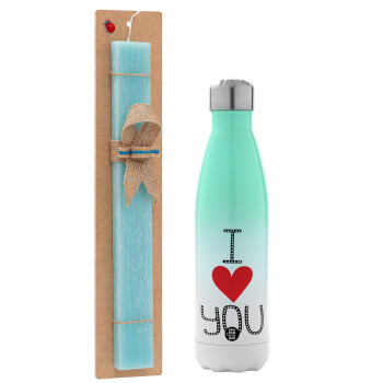 I Love You small dots, Πασχαλινή Λαμπάδα με Μεταλλικό παγούρι θερμός Πράσινο/Λευκό (Stainless steel), διπλού τοιχώματος, 500ml & κερί αρωματικό πλακέ (30cm) (ΤΙΡΚΟΥΑΖ)