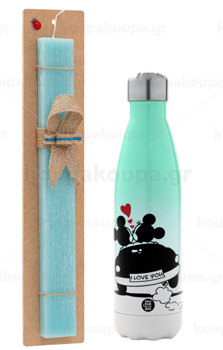 Love Car, Πασχαλινή Λαμπάδα με Μεταλλικό παγούρι θερμός Πράσινο/Λευκό (Stainless steel), διπλού τοιχώματος, 500ml & κερί αρωματικό πλακέ (30cm) (ΤΙΡΚΟΥΑΖ)