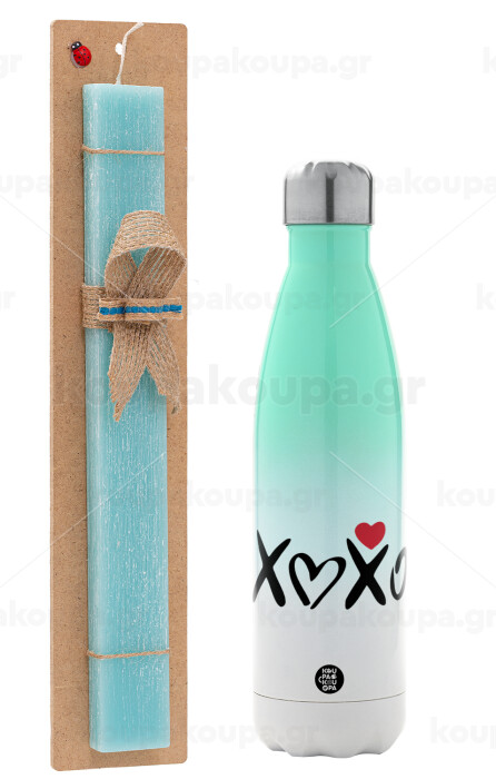 xoxo, Πασχαλινή Λαμπάδα με Μεταλλικό παγούρι θερμός Πράσινο/Λευκό (Stainless steel), διπλού τοιχώματος, 500ml & κερί αρωματικό πλακέ (30cm) (ΤΙΡΚΟΥΑΖ)