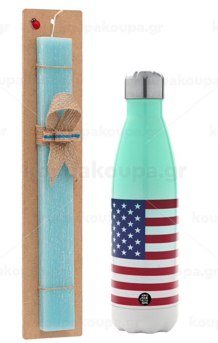 Σημαία Αμερικής, Πασχαλινή Λαμπάδα με Μεταλλικό παγούρι θερμός Πράσινο/Λευκό (Stainless steel), διπλού τοιχώματος, 500ml & κερί αρωματικό πλακέ (30cm) (ΤΙΡΚΟΥΑΖ)