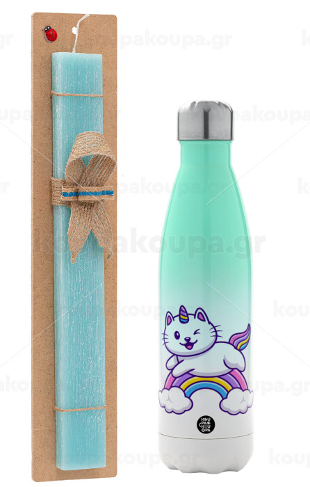 Cute cat unicorn, Πασχαλινή Λαμπάδα με Μεταλλικό παγούρι θερμός Πράσινο/Λευκό (Stainless steel), διπλού τοιχώματος, 500ml & κερί αρωματικό πλακέ (30cm) (ΤΙΡΚΟΥΑΖ)