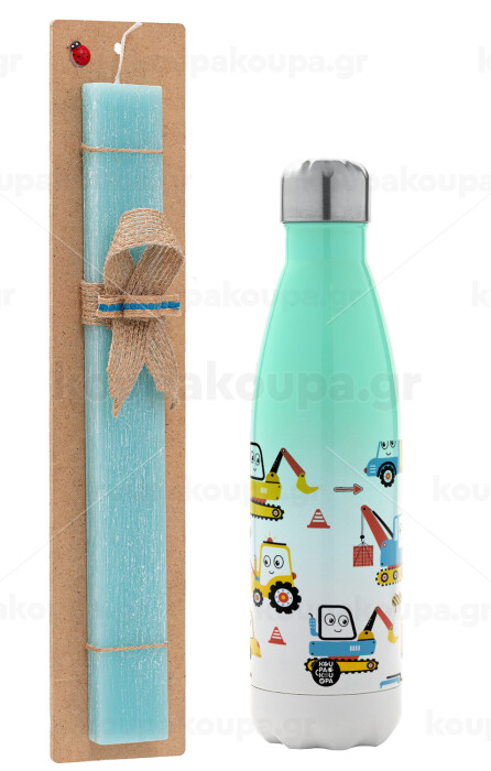Hand drawing building truck, Πασχαλινή Λαμπάδα με Μεταλλικό παγούρι θερμός Πράσινο/Λευκό (Stainless steel), διπλού τοιχώματος, 500ml & κερί αρωματικό πλακέ (30cm) (ΤΙΡΚΟΥΑΖ)