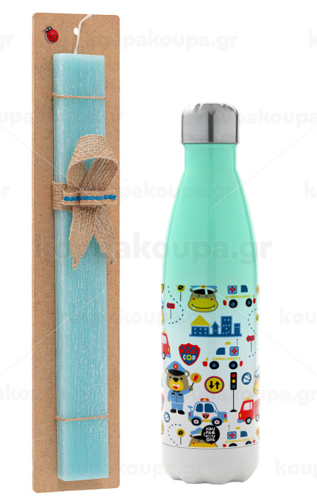 Rescue team cartoon, Πασχαλινή Λαμπάδα με Μεταλλικό παγούρι θερμός Πράσινο/Λευκό (Stainless steel), διπλού τοιχώματος, 500ml & κερί αρωματικό πλακέ (30cm) (ΤΙΡΚΟΥΑΖ)