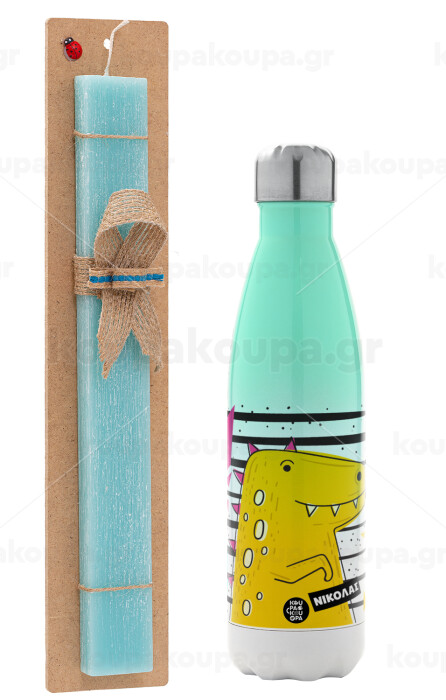 t-rex , Πασχαλινή Λαμπάδα με Μεταλλικό παγούρι θερμός Πράσινο/Λευκό (Stainless steel), διπλού τοιχώματος, 500ml & κερί αρωματικό πλακέ (30cm) (ΤΙΡΚΟΥΑΖ)