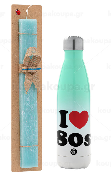 I Love 80s, Πασχαλινή Λαμπάδα με Μεταλλικό παγούρι θερμός Πράσινο/Λευκό (Stainless steel), διπλού τοιχώματος, 500ml & κερί αρωματικό πλακέ (30cm) (ΤΙΡΚΟΥΑΖ)