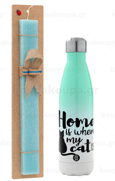 Home is where my cat is!, Πασχαλινή Λαμπάδα με Μεταλλικό παγούρι θερμός Πράσινο/Λευκό (Stainless steel), διπλού τοιχώματος, 500ml & κερί αρωματικό πλακέ (30cm) (ΤΙΡΚΟΥΑΖ)