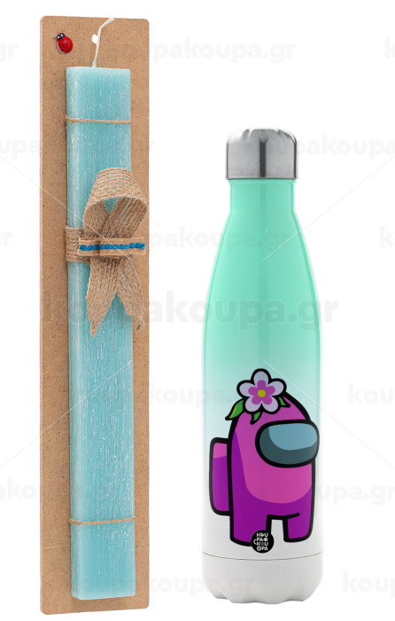 Among US girl, Πασχαλινή Λαμπάδα με Μεταλλικό παγούρι θερμός Πράσινο/Λευκό (Stainless steel), διπλού τοιχώματος, 500ml & κερί αρωματικό πλακέ (30cm) (ΤΙΡΚΟΥΑΖ)
