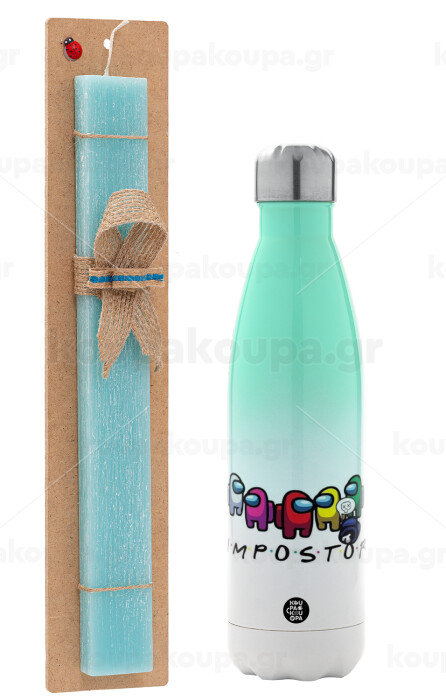 Among US impostor, Πασχαλινή Λαμπάδα με Μεταλλικό παγούρι θερμός Πράσινο/Λευκό (Stainless steel), διπλού τοιχώματος, 500ml & κερί αρωματικό πλακέ (30cm) (ΤΙΡΚΟΥΑΖ)