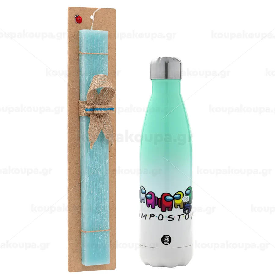Among US impostor, Πασχαλινή Λαμπάδα με Μεταλλικό παγούρι θερμός Πράσινο/Λευκό (Stainless steel), διπλού τοιχώματος, 500ml & κερί αρωματικό πλακέ (30cm) (ΤΙΡΚΟΥΑΖ)