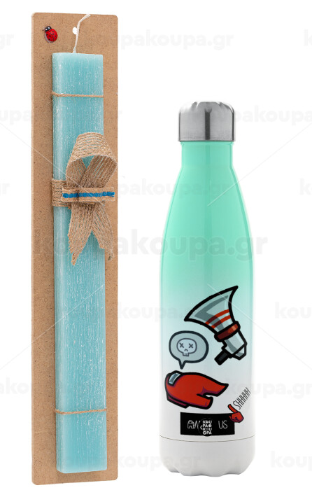 Among US Shhhh!!!, Πασχαλινή Λαμπάδα με Μεταλλικό παγούρι θερμός Πράσινο/Λευκό (Stainless steel), διπλού τοιχώματος, 500ml & κερί αρωματικό πλακέ (30cm) (ΤΙΡΚΟΥΑΖ)