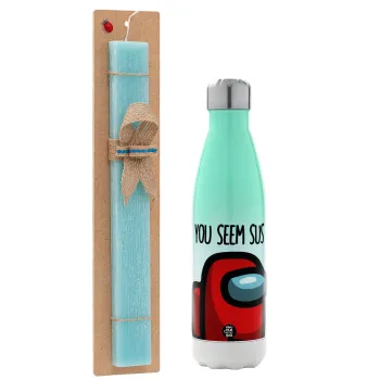 Among US, you seem sus, Πασχαλινή Λαμπάδα με Μεταλλικό παγούρι θερμός Πράσινο/Λευκό (Stainless steel), διπλού τοιχώματος, 500ml & κερί αρωματικό πλακέ (30cm) (ΤΙΡΚΟΥΑΖ)