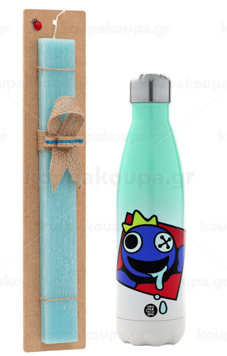 Blue, Rainbow friends, Πασχαλινή Λαμπάδα με Μεταλλικό παγούρι θερμός Πράσινο/Λευκό (Stainless steel), διπλού τοιχώματος, 500ml & κερί αρωματικό πλακέ (30cm) (ΤΙΡΚΟΥΑΖ)
