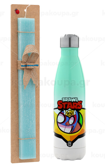 Brawl Stars El primo, Πασχαλινή Λαμπάδα με Μεταλλικό παγούρι θερμός Πράσινο/Λευκό (Stainless steel), διπλού τοιχώματος, 500ml & κερί αρωματικό πλακέ (30cm) (ΤΙΡΚΟΥΑΖ)