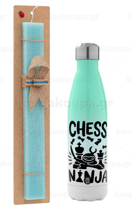 Chess ninja, Πασχαλινή Λαμπάδα με Μεταλλικό παγούρι θερμός Πράσινο/Λευκό (Stainless steel), διπλού τοιχώματος, 500ml & κερί αρωματικό πλακέ (30cm) (ΤΙΡΚΟΥΑΖ)