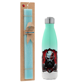 God of war, Πασχαλινή Λαμπάδα με Μεταλλικό παγούρι θερμός Πράσινο/Λευκό (Stainless steel), διπλού τοιχώματος, 500ml & κερί αρωματικό πλακέ (30cm) (ΤΙΡΚΟΥΑΖ)