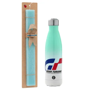 gran turismo, Πασχαλινή Λαμπάδα με Μεταλλικό παγούρι θερμός Πράσινο/Λευκό (Stainless steel), διπλού τοιχώματος, 500ml & κερί αρωματικό πλακέ (30cm) (ΤΙΡΚΟΥΑΖ)