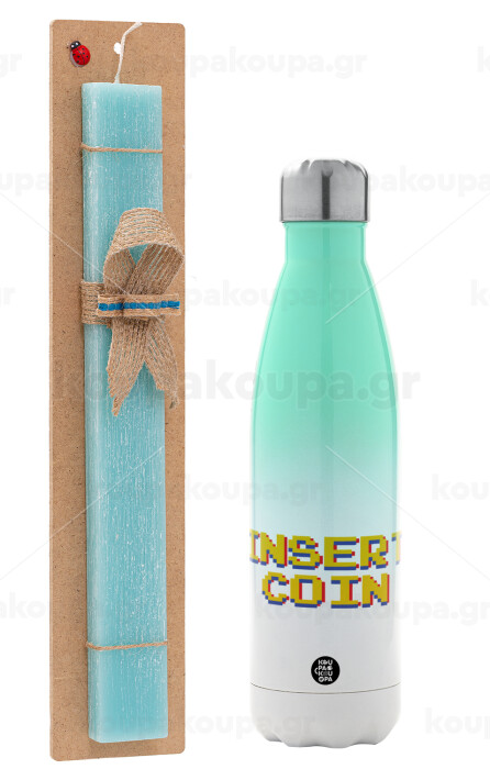 Insert coin!!!, Πασχαλινή Λαμπάδα με Μεταλλικό παγούρι θερμός Πράσινο/Λευκό (Stainless steel), διπλού τοιχώματος, 500ml & κερί αρωματικό πλακέ (30cm) (ΤΙΡΚΟΥΑΖ)