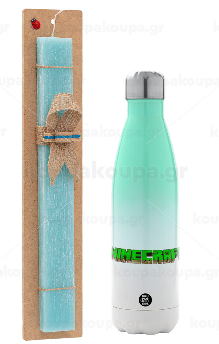 Minecraft logo green, Πασχαλινή Λαμπάδα με Μεταλλικό παγούρι θερμός Πράσινο/Λευκό (Stainless steel), διπλού τοιχώματος, 500ml & κερί αρωματικό πλακέ (30cm) (ΤΙΡΚΟΥΑΖ)