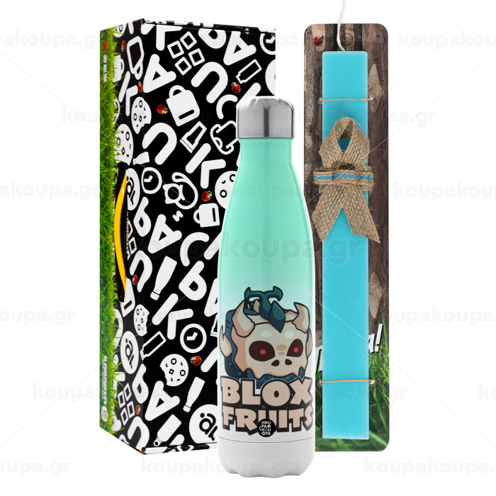 Roblox Blox Fruits, Πασχαλινή Λαμπάδα με Μεταλλικό παγούρι θερμός Πράσινο/Λευκό (Stainless steel), διπλού τοιχώματος, 500ml & κερί αρωματικό πλακέ (30cm) (ΤΙΡΚΟΥΑΖ)