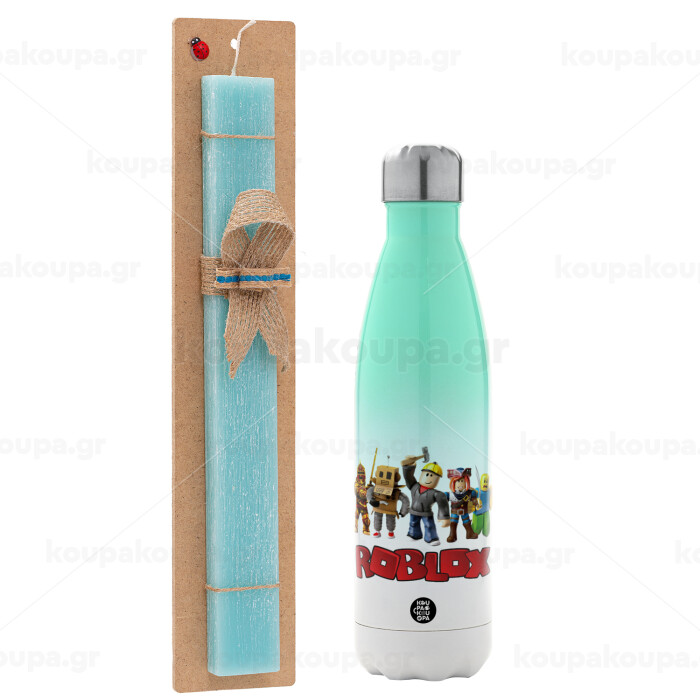 Roblox squad, Πασχαλινή Λαμπάδα με Μεταλλικό παγούρι θερμός Πράσινο/Λευκό (Stainless steel), διπλού τοιχώματος, 500ml & κερί αρωματικό πλακέ (30cm) (ΤΙΡΚΟΥΑΖ)