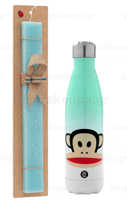 Monkey, Πασχαλινή Λαμπάδα με Μεταλλικό παγούρι θερμός Πράσινο/Λευκό (Stainless steel), διπλού τοιχώματος, 500ml & κερί αρωματικό πλακέ (30cm) (ΤΙΡΚΟΥΑΖ)