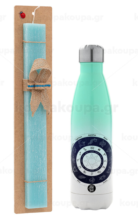 Ζωδιακός κύκλος, Πασχαλινή Λαμπάδα με Μεταλλικό παγούρι θερμός Πράσινο/Λευκό (Stainless steel), διπλού τοιχώματος, 500ml & κερί αρωματικό πλακέ (30cm) (ΤΙΡΚΟΥΑΖ)