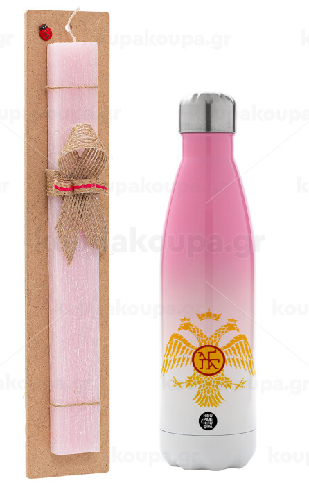 Βυζαντινή αυτοκρατορία, Πασχαλινή Λαμπάδα με Μεταλλικό παγούρι θερμός Ροζ/Λευκό (Stainless steel), διπλού τοιχώματος, 500ml & κερί αρωματικό πλακέ (30cm) (ΡΟΖ)