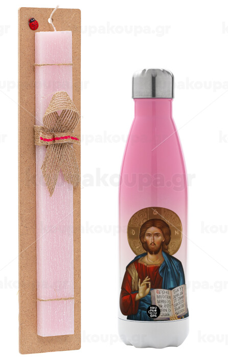 Ιησούς, Πασχαλινή Λαμπάδα με Μεταλλικό παγούρι θερμός Ροζ/Λευκό (Stainless steel), διπλού τοιχώματος, 500ml & κερί αρωματικό πλακέ (30cm) (ΡΟΖ)